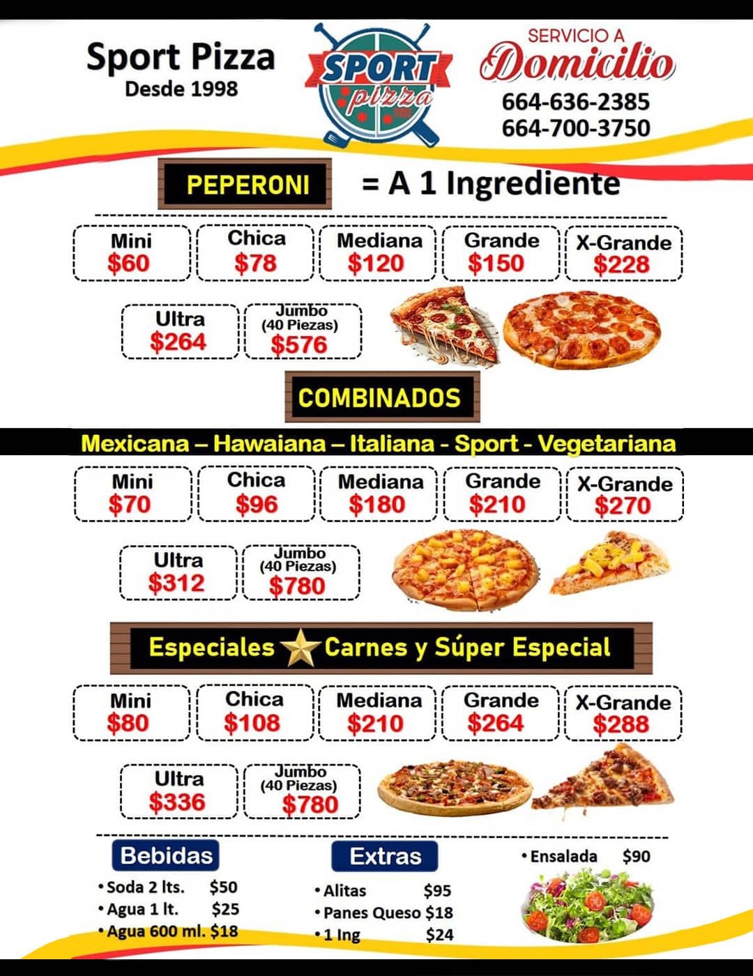 En SPORT PIZZA encontrarás una gran variedad de sabores y tamaños para satisfacer tu antojo. Ya sea que prefieras la clásica Hawaiana, la deliciosa Mexicana, una Vegetariana, la famosa Sport o una preparada con los ingredientes de tu elección, siempre tenemos una pizza para ti.